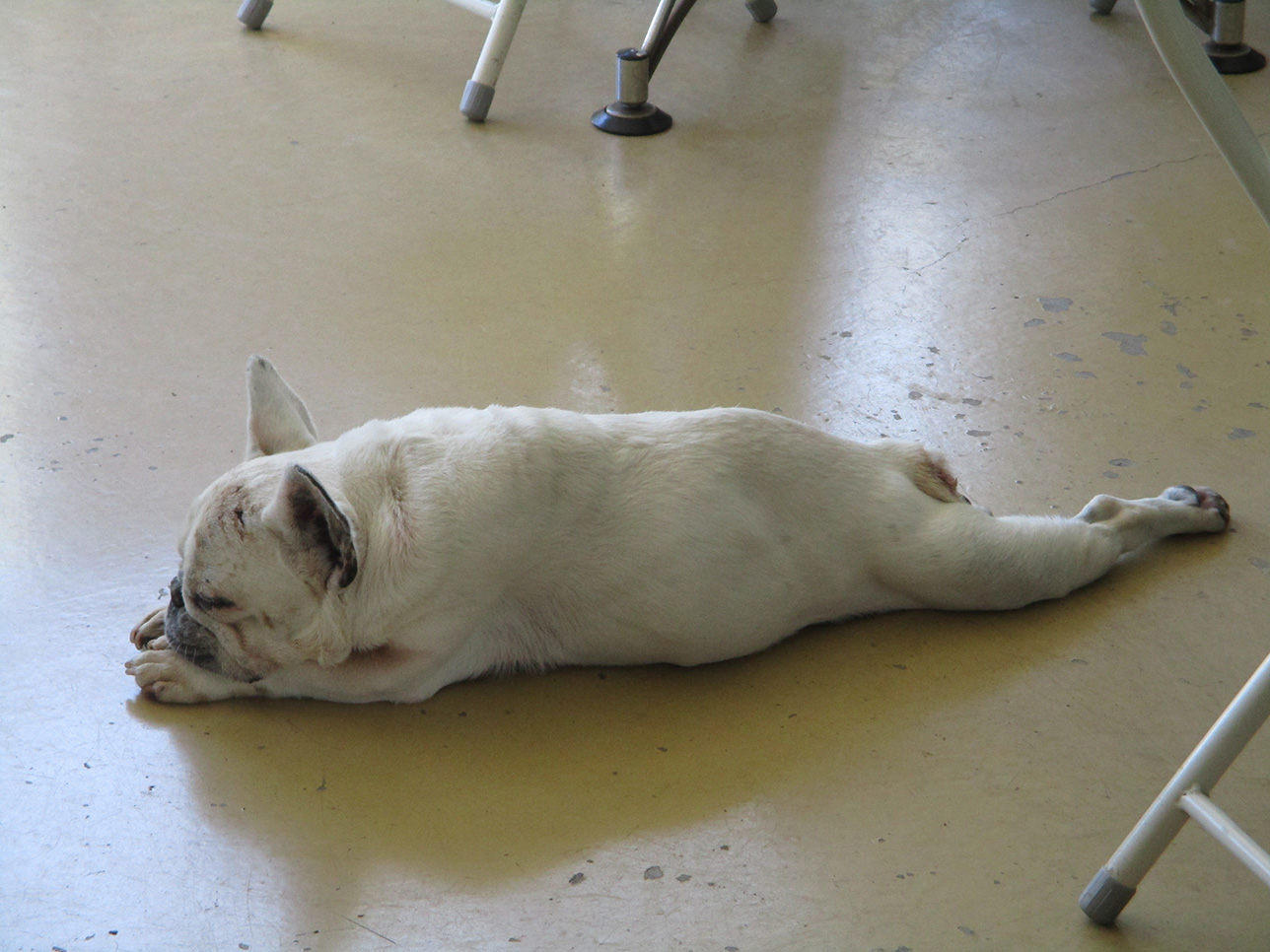 台風直撃のニュースにびびっておりましたぶんぶんですが、ご予約のお客様も無事ご来店頂き通常通りの営業が行えホッ!としました。皆様のお住まいの所は大丈夫でしたか?ぶんぶん地方は思ったより何もなく(もちろん有り難いのですが)通常の雨位でした。でも雨の中ご来店頂きありがとうございます。看板娘「はな」は、一日良く寝ており翌日晴れたので大張り切りで駆け巡っておりましたよ。写真はその後のクールダウン中です。