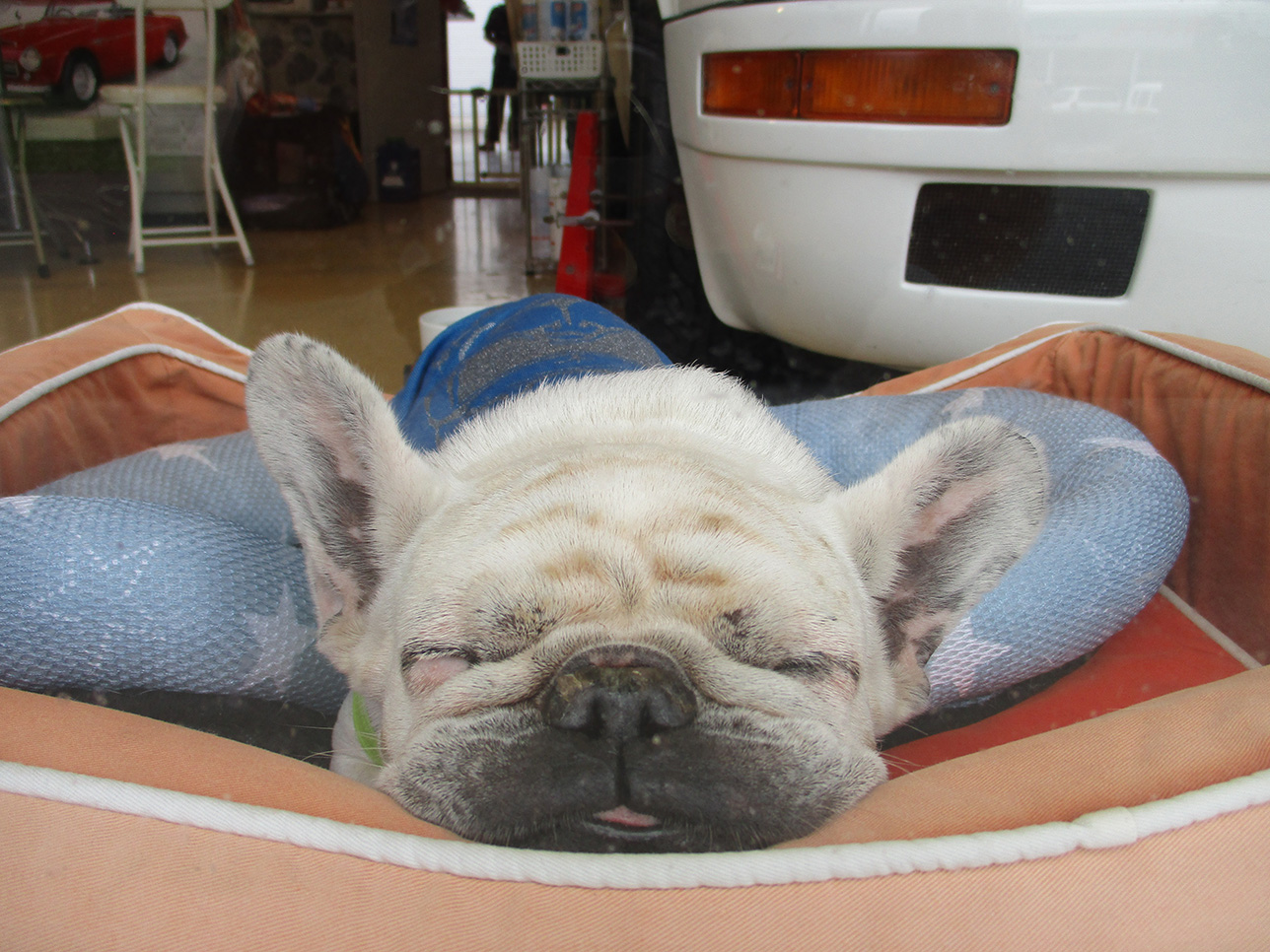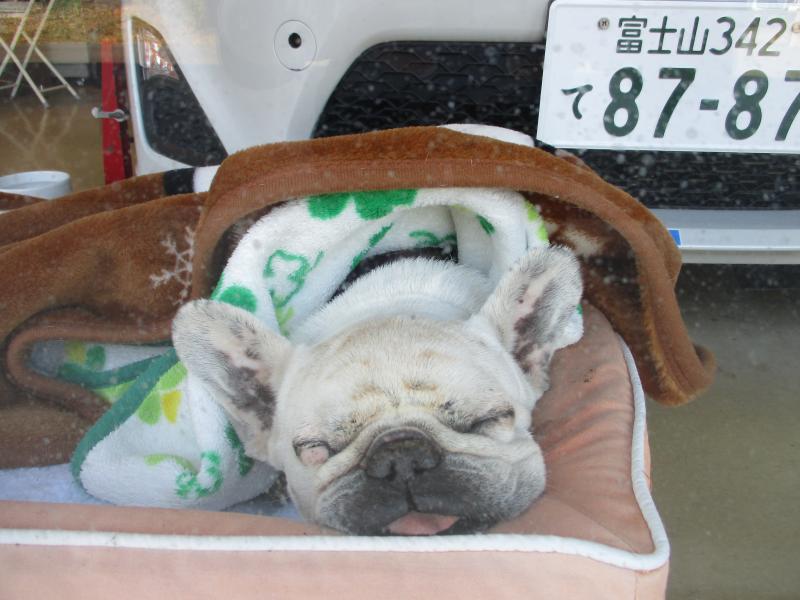 本日は、すっごい雨ですが、皆様いかがお過ごしでしょうか??(現在4日(金)午後です。)只今お預かりのお車の仕事させて頂いておりますが、一部シャッター閉めておりますが吹き付ける雨が半端ないです。台風レベルのぶんぶん地方ですが、お車の運転気を付けて下さいね。何よりも被害が無く通り過ぎてくれるといいのですが・・・。看板娘「はな」は、目が覚めてどうしましょトイレ~~と訴えています。外派はつらいね!!一緒に濡れましょ(涙)さてさて昨日は天気も良く作業以外にも沢山の方がみえて下さいました。ありがとうございます。