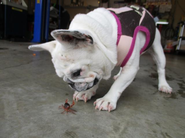 やっとお天気に恵まれてきた今日この頃。本当は今日天気予報がいまいちだったのですが、ぼちぼちの雨でハッスルする看板娘「はな」、本日のお友達はカニ。(安心して下さい食べませんよ。)皆様も秋を楽しんでおりますか??