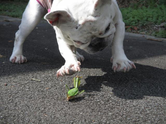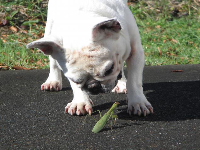 暫く天候不順が続いておりますが、皆様はいかがお過ごしでしょうか?やっと本日太陽をみる事ができ、看板娘「はな」もお散歩を楽しむ事が出来ました。何故かタイミング良くお友達のカマキリが登場!!大ハッスル「はな」ですね~~。