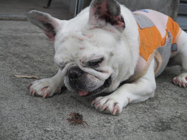 今年の梅雨は本当に梅雨らしい・・・。中々太陽とお会い出来ません!合間を縫って看板娘「はな」とカニが遊んでおりました。かなり本気モードです。(食べないので安心して下さいね。)